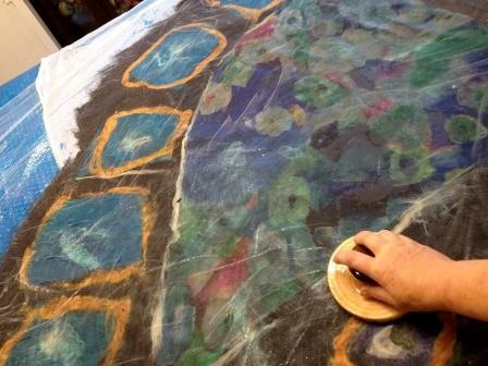 “Nuno felting is a fiber sculpting process that uses fine merino wool natural fibers, soap, water, and friction to get the wool to travel through cloth,” said Kay. The wool and other natural fibers are bonded together permanently via this process. It takes a lot of time to produce just one section of cloth; the final size is less than a third of the starting size. Notice the texture and colors in the following hats. You really need to touch the fabric to fully appreciate the unique characteristics besides the wonderful visual appeal.