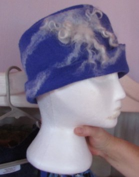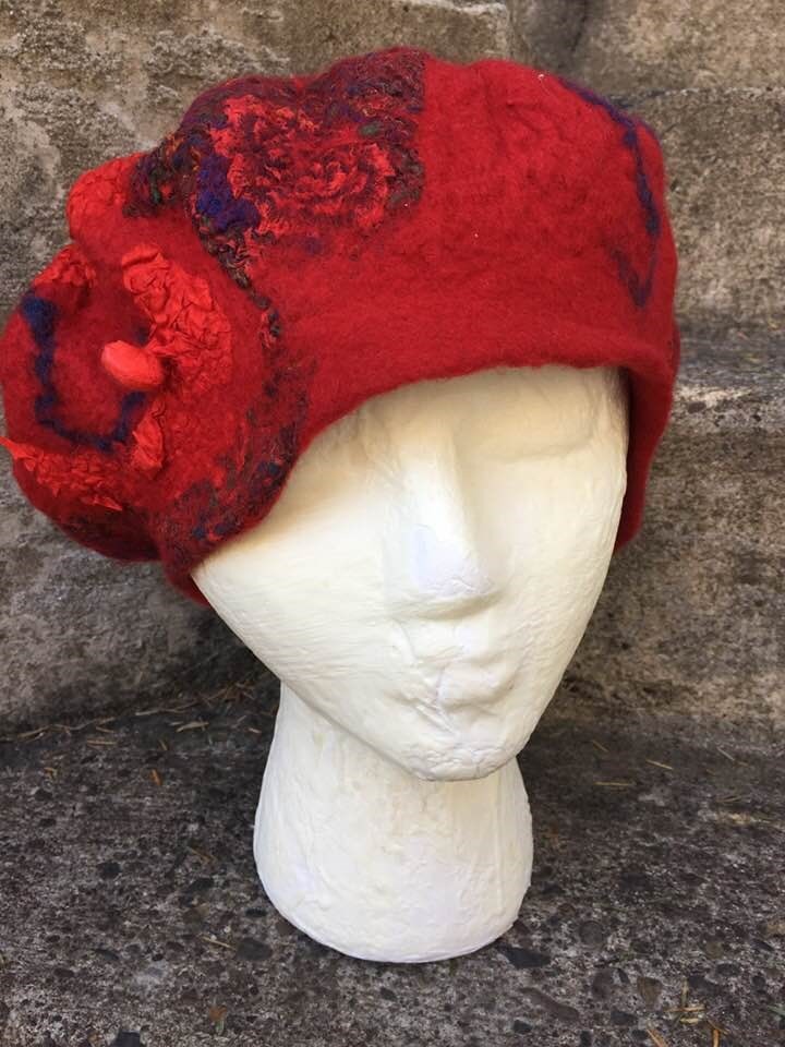 “Nuno felting is a fiber sculpting process that uses fine merino wool natural fibers, soap, water, and friction to get the wool to travel through cloth,” said Kay. The wool and other natural fibers are bonded together permanently via this process. It takes a lot of time to produce just one section of cloth; the final size is less than a third of the starting size. Notice the texture and colors in the following hats. You really need to touch the fabric to fully appreciate the unique characteristics besides the wonderful visual appeal.
