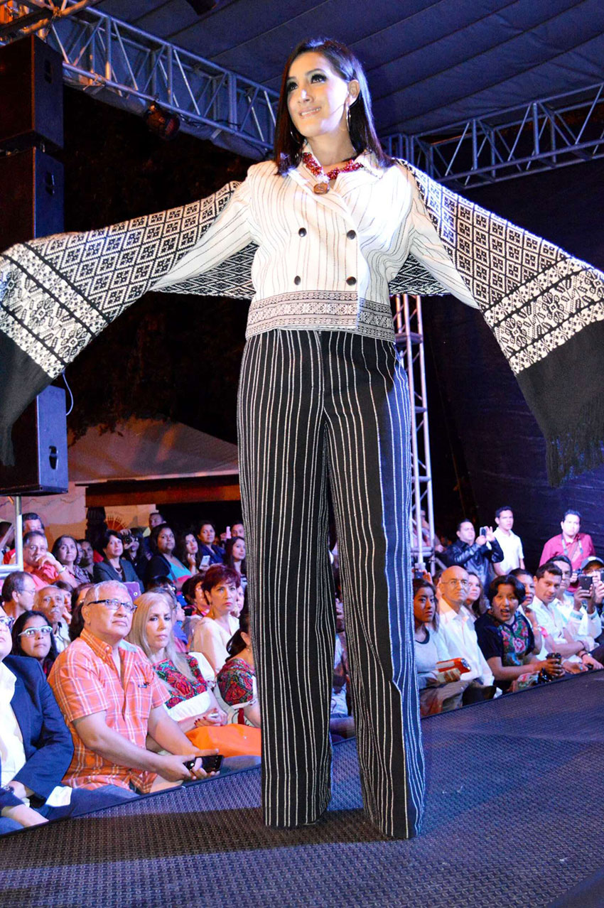 Angahuan rebozo with outfit designed to match at the Michoacán Rebozo Fashion Show, part of the Tianguis de Domingo de Ramo. Alejandro Linares García