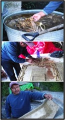 Artisans in the Otomi village of San Pablito in northern Puebla, Mexico still engage in this folkart. San Pablito is one of the highland villages which make amate paper in the traditional way. The bark is first stripped from the tree, soaked, and then boiled for many hours until the fibers are soft enough to manipulate. The skeins of fibers are separated into thin strands and sorted into colors, which make the distinctive tonal browns of the paper artworks.