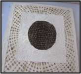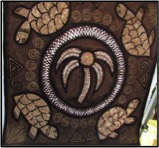 Designs for the artworks are carefully blocked out onto wooden boards and the fibers are laid down on the boards, pounded together and finger pinched, twisted and woven into the outlined design. When the whole work is finished, which sometimes takes two days to complete, they are hauled up to the sunniest part of the roof to dry. The whole process can take over two weeks to make one piece of art.